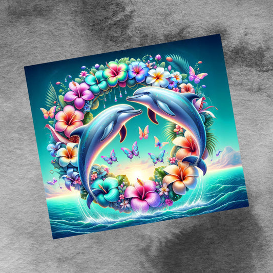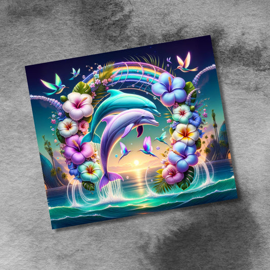 Dolphins Dancing in Rainbow of Hibiscus Flowers 20oz Skinny Tumbler Designs, Seamless 20 oz Tumbler Wrap Template, PNG Digital Download