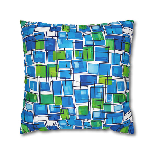 Abstract Interplay of Blue and Green Squares with Meandering Lines Spun Polyester Square Pillowcase 3 Sizes