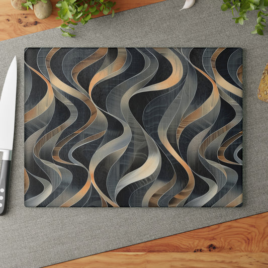 Artistic Fusion of Wavy Lines in a Palette of Silver, Gold, and Dark Hues Glass Cutting Board, Charcuterie Serving Tray 2 Sizes