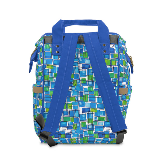 Abstract Interplay of Blue and Green Squares with Meandering Lines Multifunctional Diaper Backpack