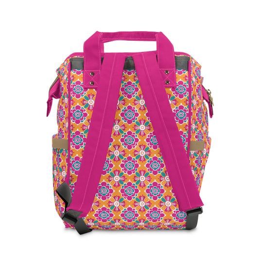 Array of Stylized Floral Motifs in Vivid Pink, Teal, and White Set Against a Warm Orange Backdrop Multifunctional Diaper Backpack