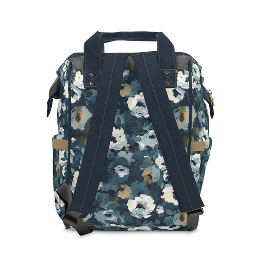 Chic and Artistic Floral Blooms in Shades of Navy, Gray, and Soft Gold Multifunctional Diaper Backpack