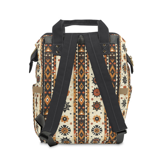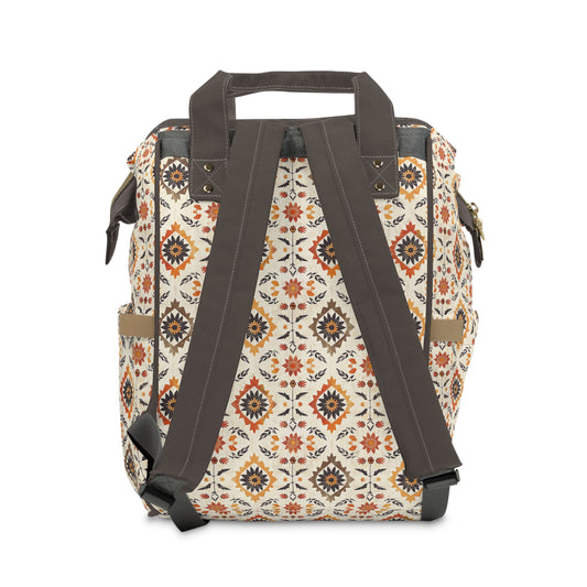 Bohemian Intricate Geometric and Floral Folk Design in Burnt Orange, Deep Brown, and Creamy Beige Multifunctional Diaper Backpack