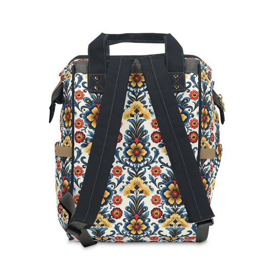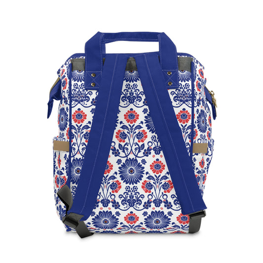 Charming Folk Blooms in Classic Polish Pottery Inspired Floral Pattern in Blue and Red Multifunctional Diaper Backpack
