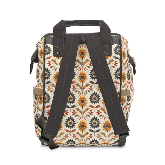 Boho Chic Earth Tone Floral and Folk Art Design in Burnt Orange, Deep Brown, and Creamy Beige Multifunctional Diaper Backpack