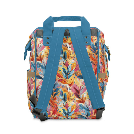 Vibrant Autumn Feathers in Hues of Orange, Yellow, Blue, and Pink on a Textured Background Multifunctional Diaper Backpack