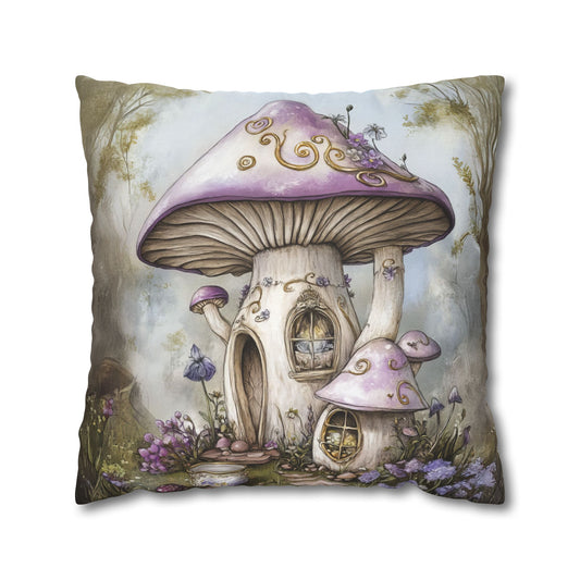 Lavender Mushroom Cottage Nestled in a Blooms of Enchantment Spun Polyester Square Pillowcase 4 Sizes