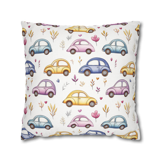 Vintage Beetle Parade Car Pattern with Floral Accents Spun Polyester Square Pillowcase 4 Sizes