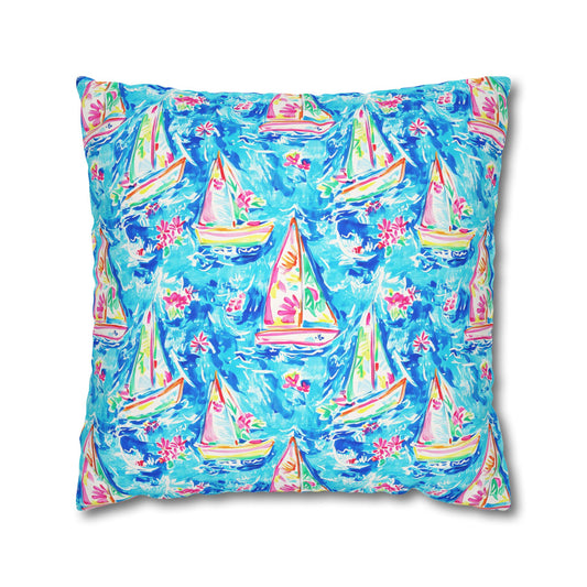 Tropical Regatta Vibrant Sailboats & Blossoms on Ocean Waves Spun Polyester Square Pillowcase 4 Sizes