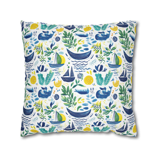 Sailboats, Waves, and Ocean Flora in Blue & Yellow Spun Polyester Square Pillowcase 4 Sizes