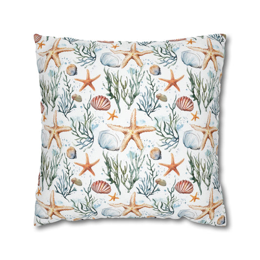 Ocean Breeze Watercolor Starfish, Seashells & Seaweed Design Spun Polyester Square Pillowcase 4 Sizes