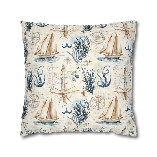 Vintage Nautical Explorer Sailing Ship, Lighthouse & Ocean Sketches Spun Polyester Square Pillowcase 4 Sizes