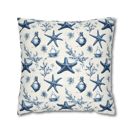 Vintage Nautical Elegance Blue Starfish, Sailboats & Ocean Treasures Spun Polyester Square Pillowcase 4 Sizes