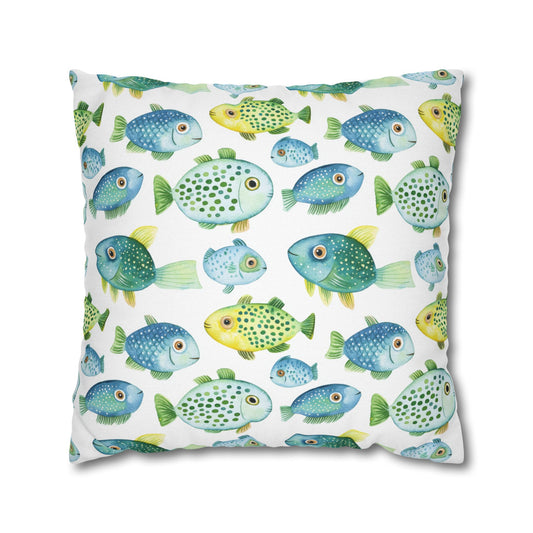 Playful Fish Parade in Ocean Blues & Greens Spun Polyester Square Pillowcase 4 Sizes