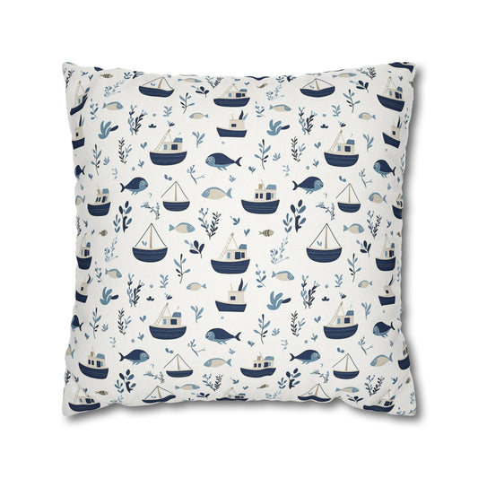 Coastal Catch Charming Fishing Boats & Ocean Life in Soft Blues Spun Polyester Square Pillowcase 4 Sizes