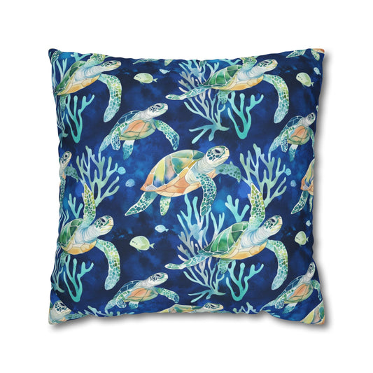 Vibrant Watercolor Sea Turtles Swimming Among Coral Reefs Spun Polyester Square Pillowcase 4 Sizes