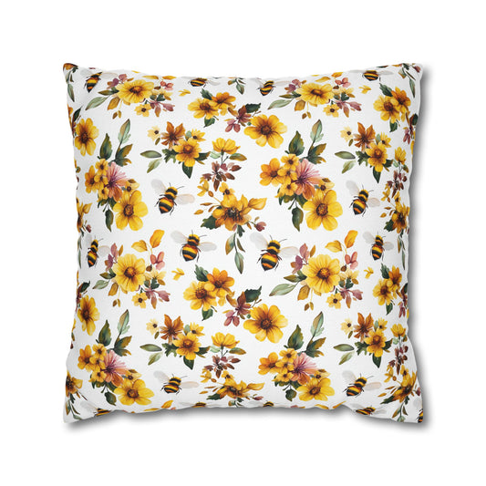 Golden Blooms & Bumblebees Floral Garden in Warm Honey Tones Spun Polyester Square Pillowcase 4 Sizes