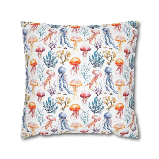 Colorful Watercolor Jellyfish & Coral Wonderland Spun Polyester Square Pillowcase 4 Sizes