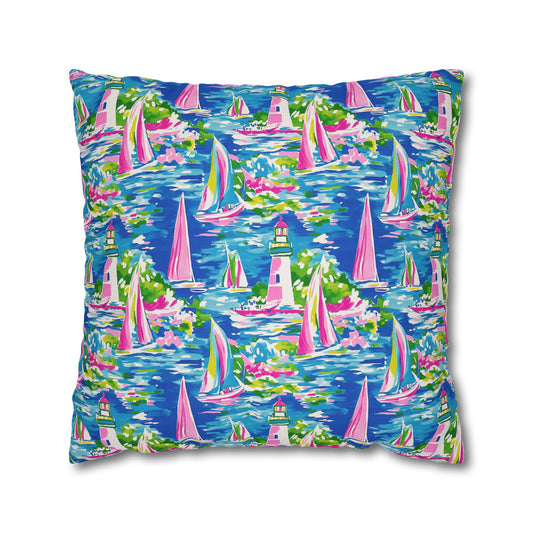 Coastal Breeze Sailboats & Lighthouse in a Seaside Paradise Spun Polyester Square Pillowcase 4 Sizes