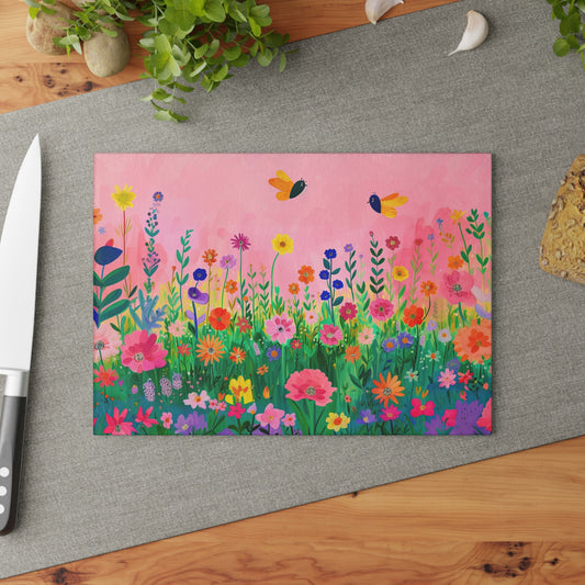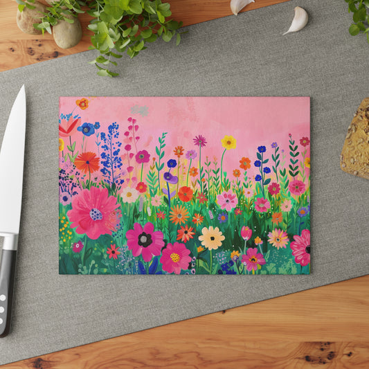 Blossoms in Bloom: Spring Wildflowers Against a Pink Background Glass Cutting Board, Charcuterie Serving Tray 2 Sizes