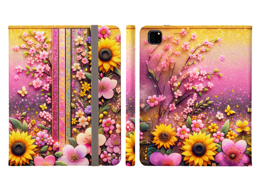 Spring Floral Daisy Pink Purple Glitter Flowers and Sunflowers Lover Ipad Pro 11 & Pro 12.9 Protective Case and Pencil Holder