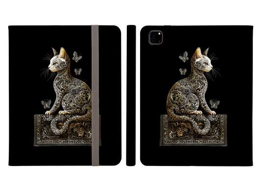 Ornate Black and Gold Paisley Cat with Fluttering Butterflies Ipad Pro 11 & Pro 12.9 Protective Case and Pencil Holder
