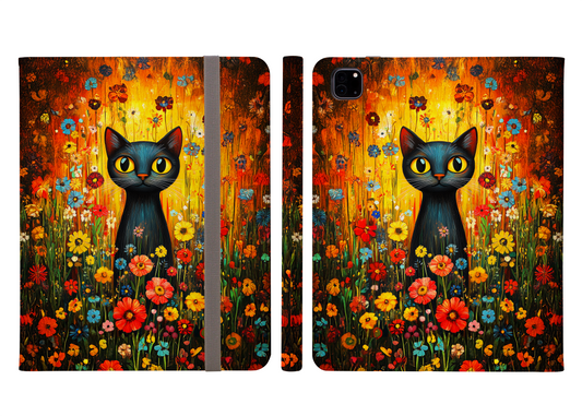 Whimsical Cat Amidst a Colorful Floral Meadow Ipad Pro 11 & Pro 12.9 Protective Case and Pencil Holder