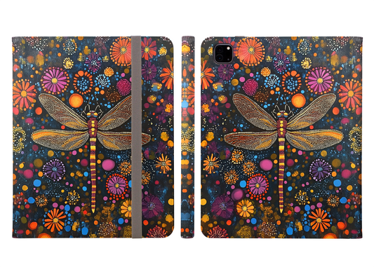 Vibrant Dragonfly Amidst a Kaleidoscope of Dot-Painted Blooms Ipad Pro 11 & Pro 12.9 Protective Case and Pencil Holder