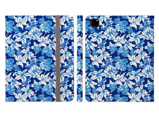 Oceanic Bloom: Watercolor Tropical Flowers in White and Blue against a Deep Blue Ipad Pro 11 & Pro 12.9 Protective Case and Pencil Holder