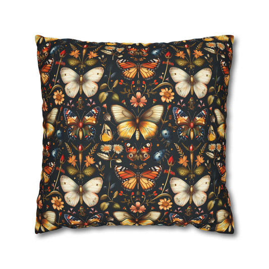 Enchanted Garden of Butterflies and Botanicals in Rich Autumn Hues on a Deep Night Background Polyester Square Pillowcase 4 Sizes