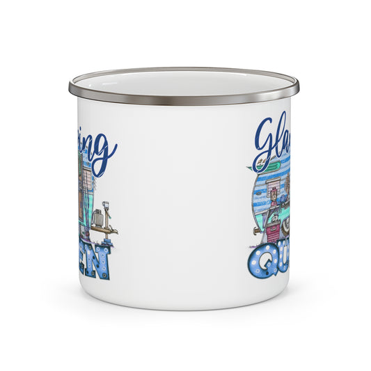 Glamping Queen with Retro Camping Trailer in Blue - 12oz Enamel Camping Mug