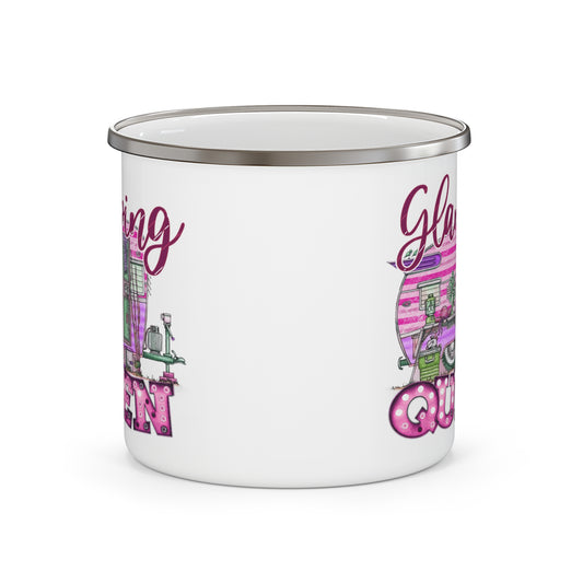 Glamping Queen with Retro Camping Trailer in Pink - 12oz Enamel Camping Mug