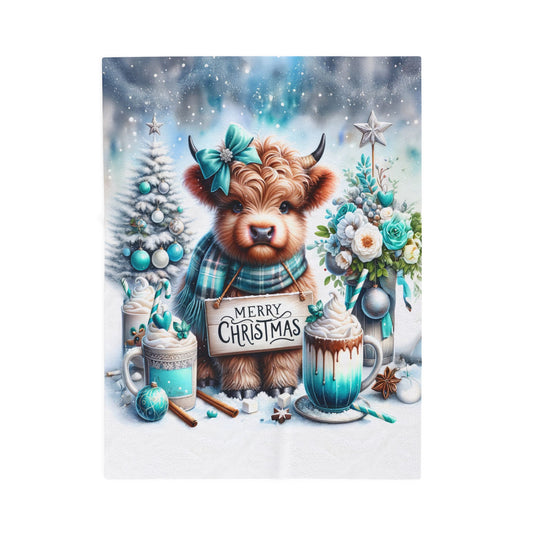 Baby Highland Cow Teal Merry Christmas Velveteen Plush Blanket 3 Sizes