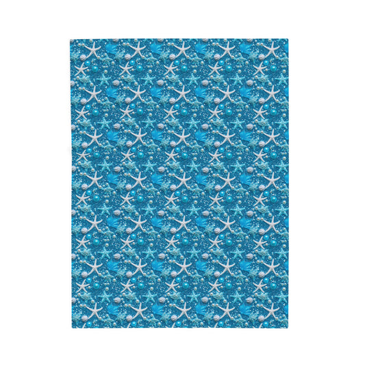 Starfish Seashells Peals Sparkling Blue and White Print Velveteen Plush Blanket 3 Sizes