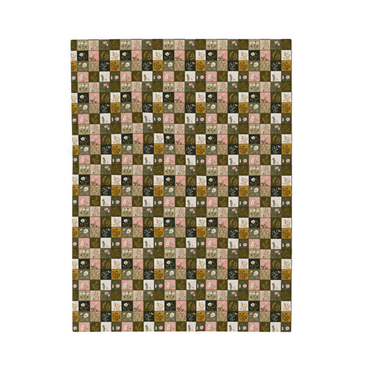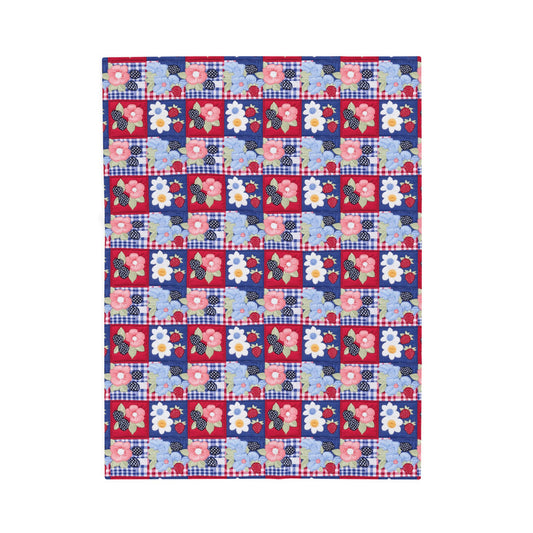 Spring Flowers, Berries in Gingham Print Patchwork Quilted Print Velveteen Plush Blanket 3 Sizes