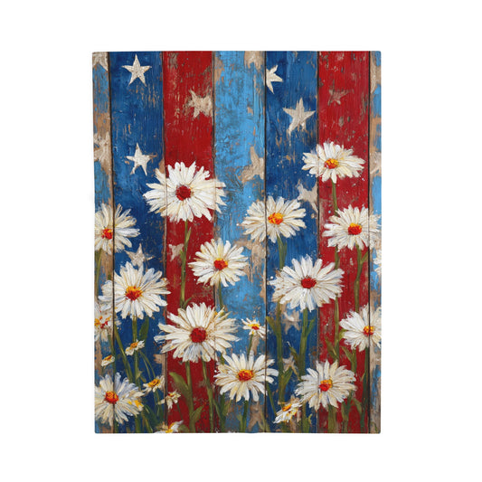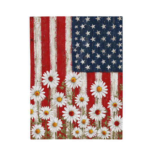American Flag with Spring Daisies Print Velveteen Plush Blanket 3 Sizes