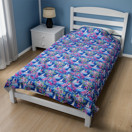 Sailing Tropics: Watercolor Sailboats Amidst Ocean Waves, Tropical Flowers, and Palm Trees Velveteen Plush Blanket 3 Sizes