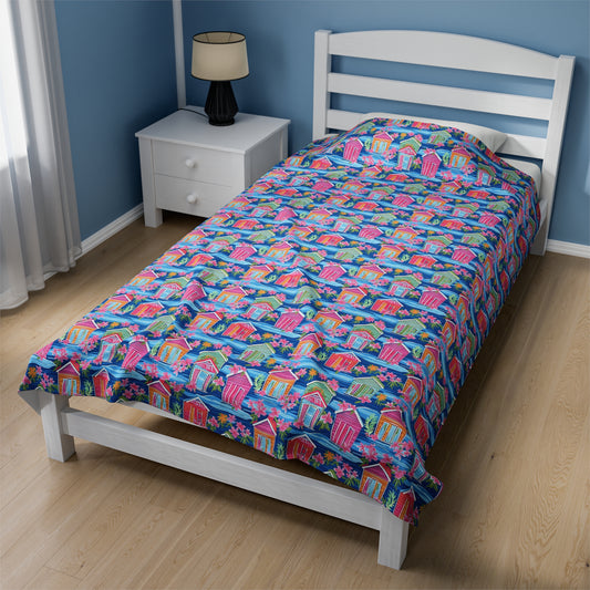 Seaside Serenade: Watercolor Beach Houses Amidst Blooming Florals Velveteen Plush Blanket 3 Sizes