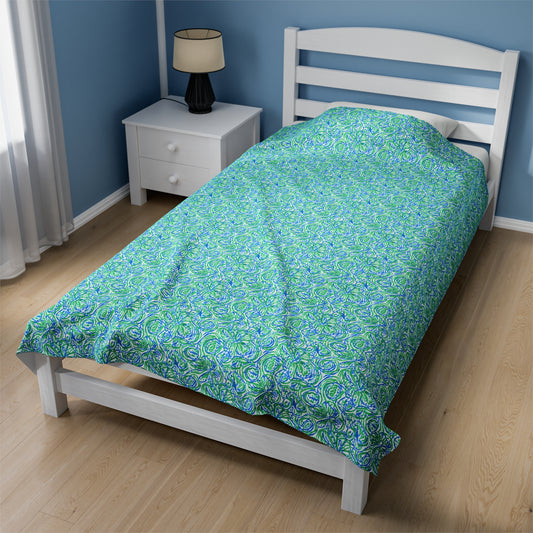 Emerald Tide: Swirling Green and Blue Flowers Velveteen Plush Blanket 3 Sizes