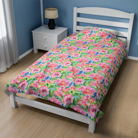 Bright Blooms: Pink and Blue Watercolor Hibiscus in Vivid Splendor Velveteen Plush Blanket 3 Sizes