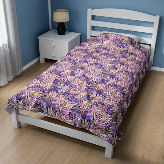 Summer Harmony: Pink and Blue Blooms with Lush Green Leaves Velveteen Plush Blanket 3 Sizes