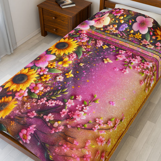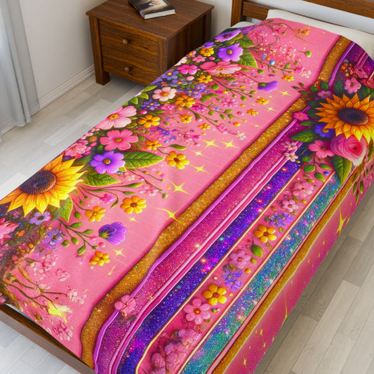 Sunflowers Spring Floral Daisy Pink Purple Glitter Flowers Velveteen Plush Blanket 3 Sizes