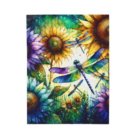 Dragonflies with Sunflowers Purple Alcohol Ink Velveteen Plush Blanket 3 Sizes