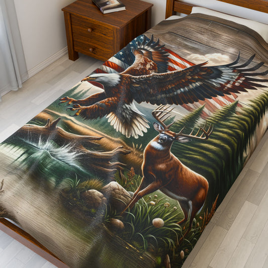 American Flag , American Bald Eagle Buck Deer Hunting Velveteen Plush Blanket 3 Sizes