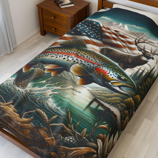 American Flag Trout Fishing Deer Camo Velveteen Plush Blanket 3 Sizes