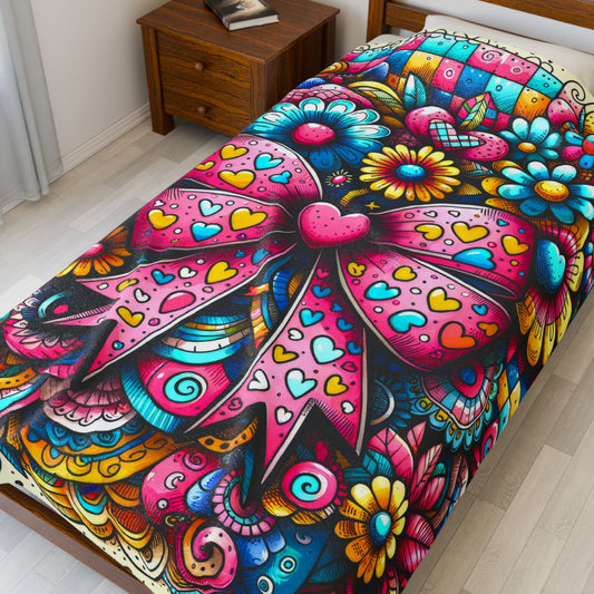 Coquette Pink Bow Hearts and Flowers Velveteen Plush Blanket 3 Sizes