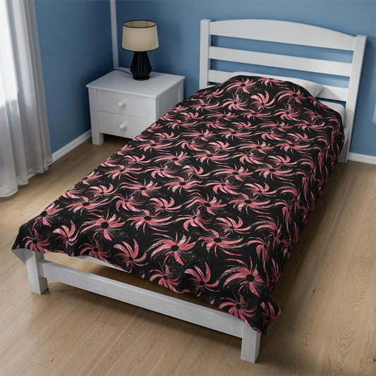 Stellar Blooms of Cosmic Pink on Midnight Black Design Velveteen Plush Blanket 3 Sizes