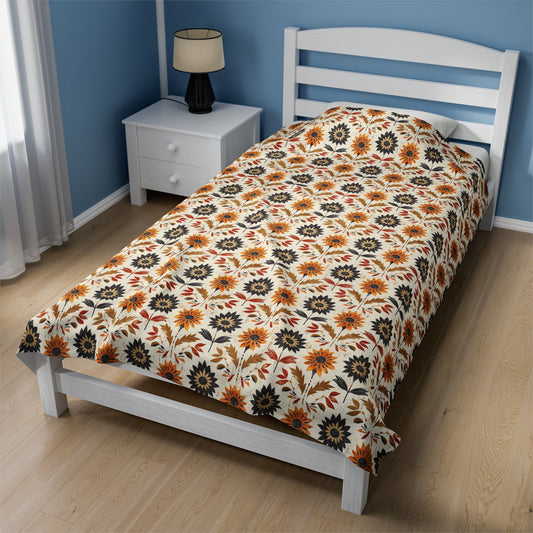 Autumn-Inspired Bohemian Floral Pattern Burnt Orange, Deep Brown and Creamy Beige Velveteen Plush Blanket 3 Sizes