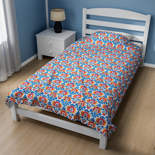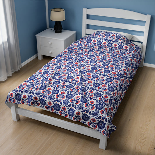Charming Folk Blooms in Classic Polish Pottery Inspired Floral Pattern in Blue and Red Velveteen Plush Blanket 3 Sizes