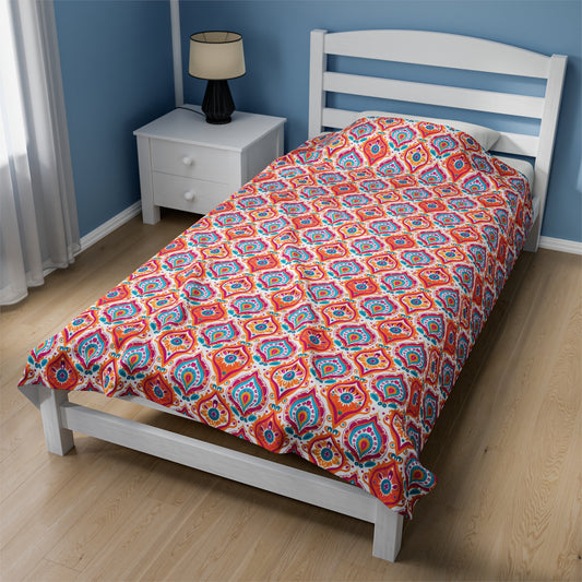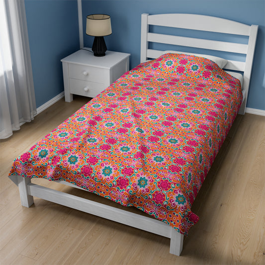Bohemian Rhapsody Exquisite & Colorful Boho Pattern of Bold Hues of Blue, Pink, and Orange Velveteen Plush Blanket 3 Sizes